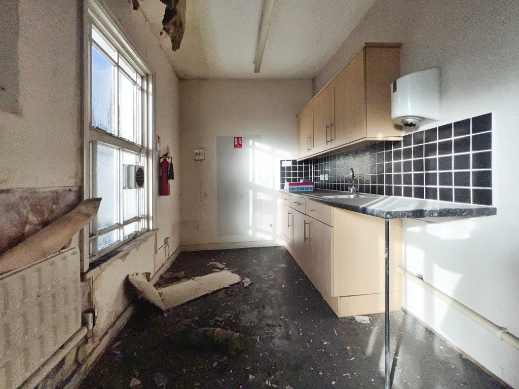 | Staff room/kitchen: | 20' 2'' x 18' 8'' (6.149m x 5.685m) Measured it to maximum pints, two single glazed windows to the front, three electric radiators, fitted with matching: drawers, base and wall cabinets, stainless steel sink . |